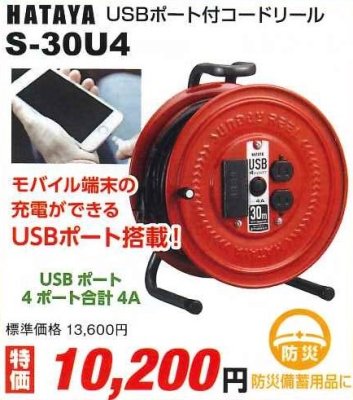USBポート付きコードリール P2-1406 P3-1610 [S-30U4]